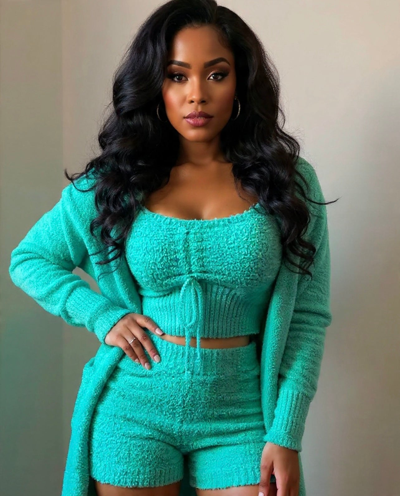Regular price $69.99Fitted with fluffy knitted material, this 3pc robe & shorts set not only feels good against your skin but looks good too. Comfortable and cozy loungewear with a luxe feel that you will want to wear all day.