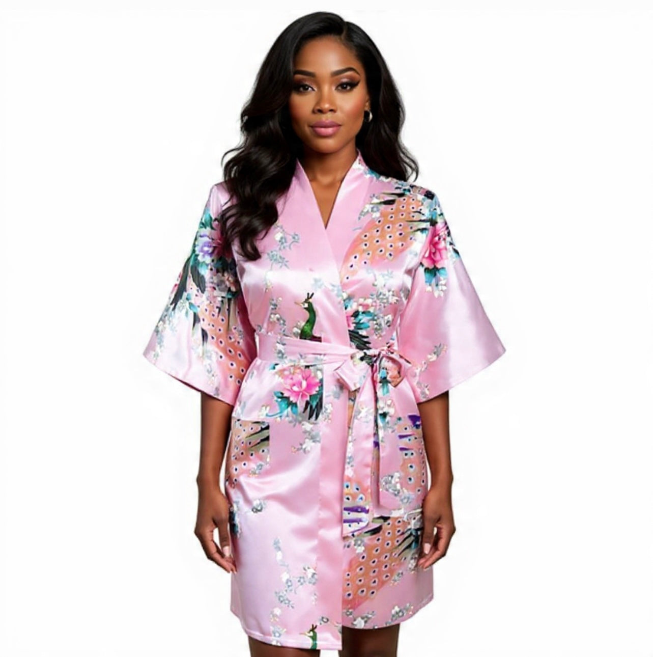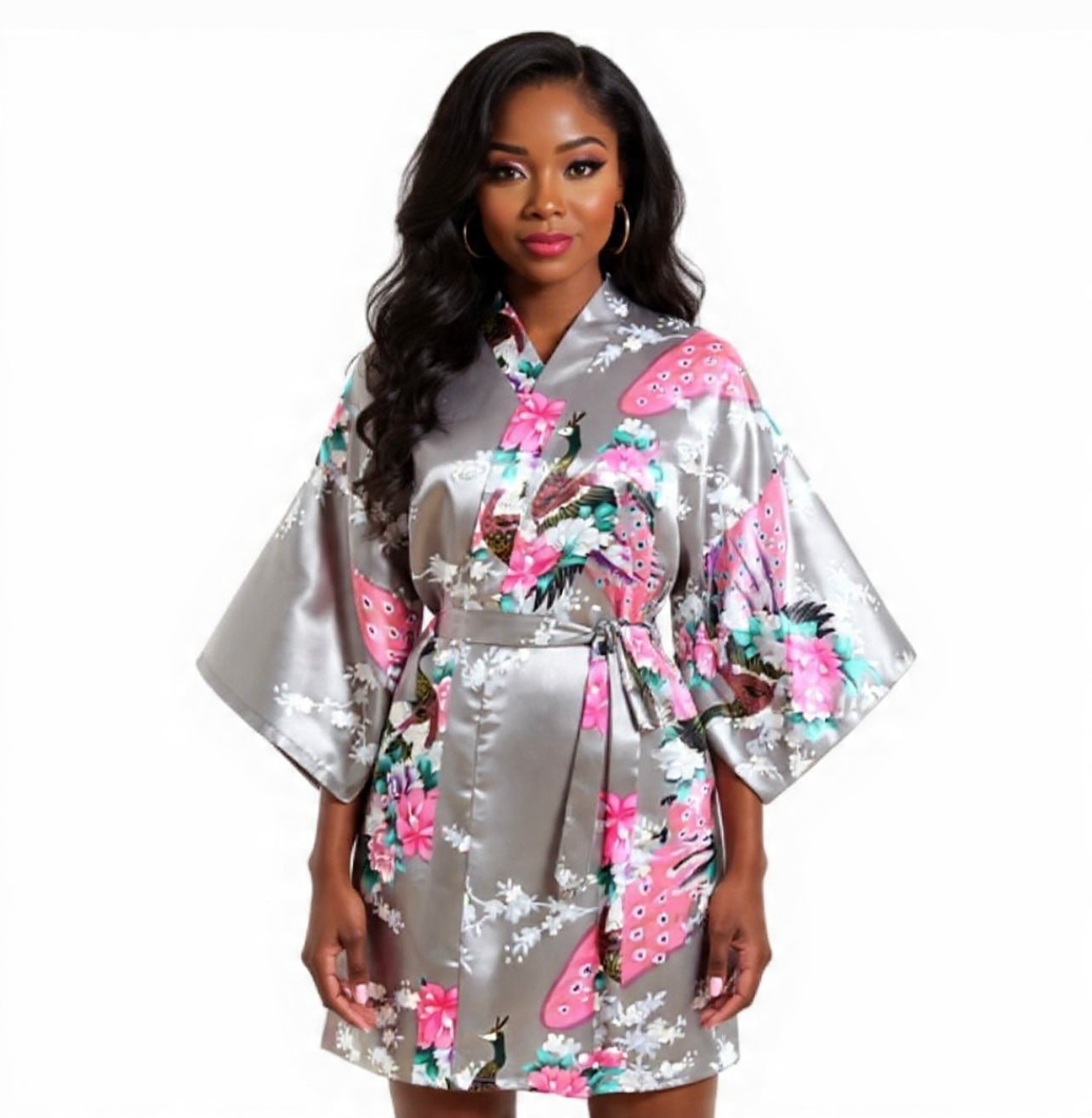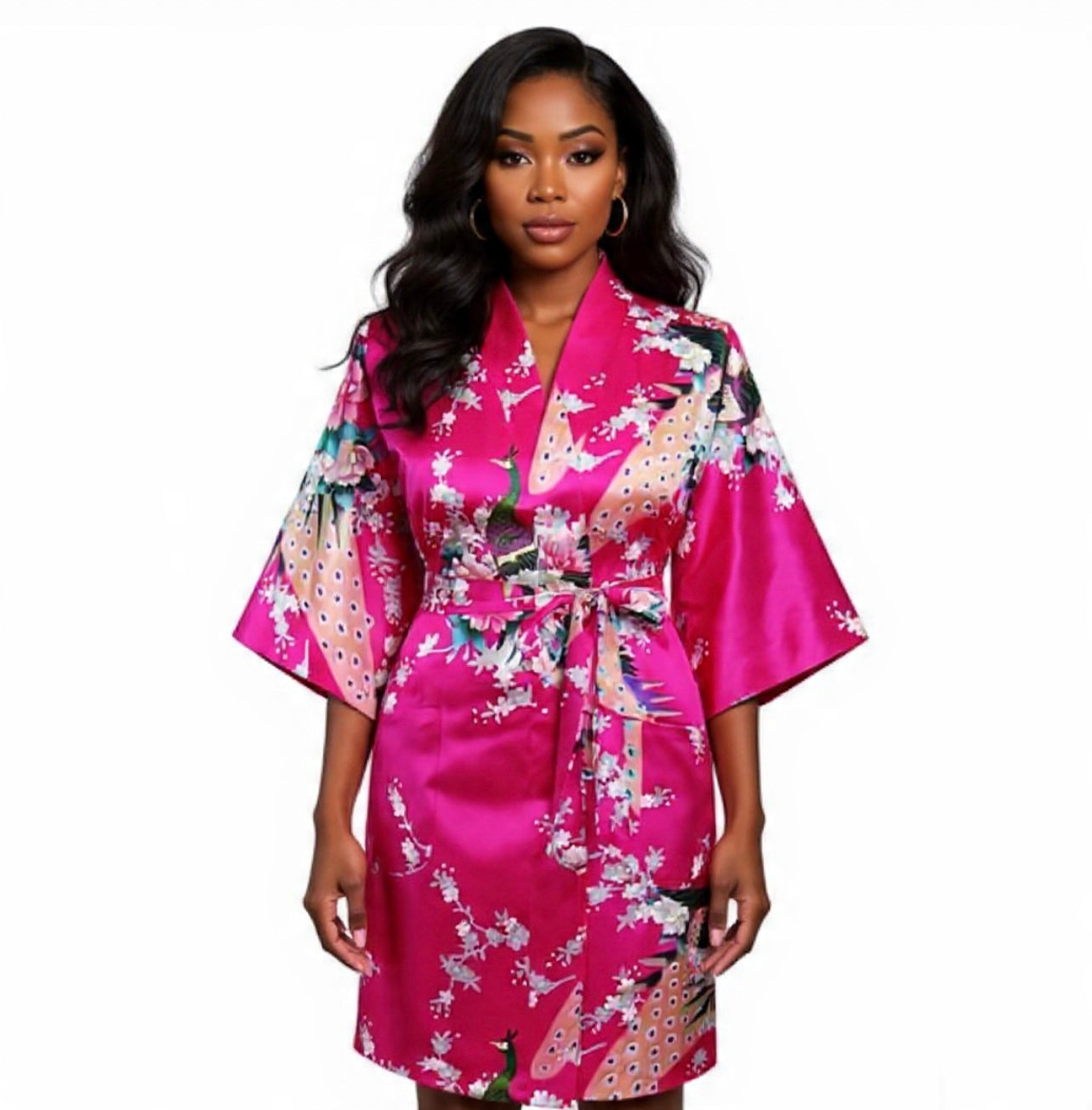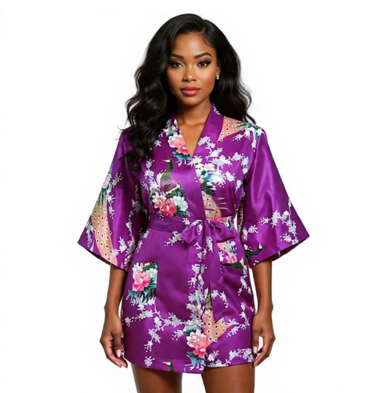 For bedtime, lounging and beyond. In luxe silky material, a kimono style robe with a v-neckline and matching print tie waist.