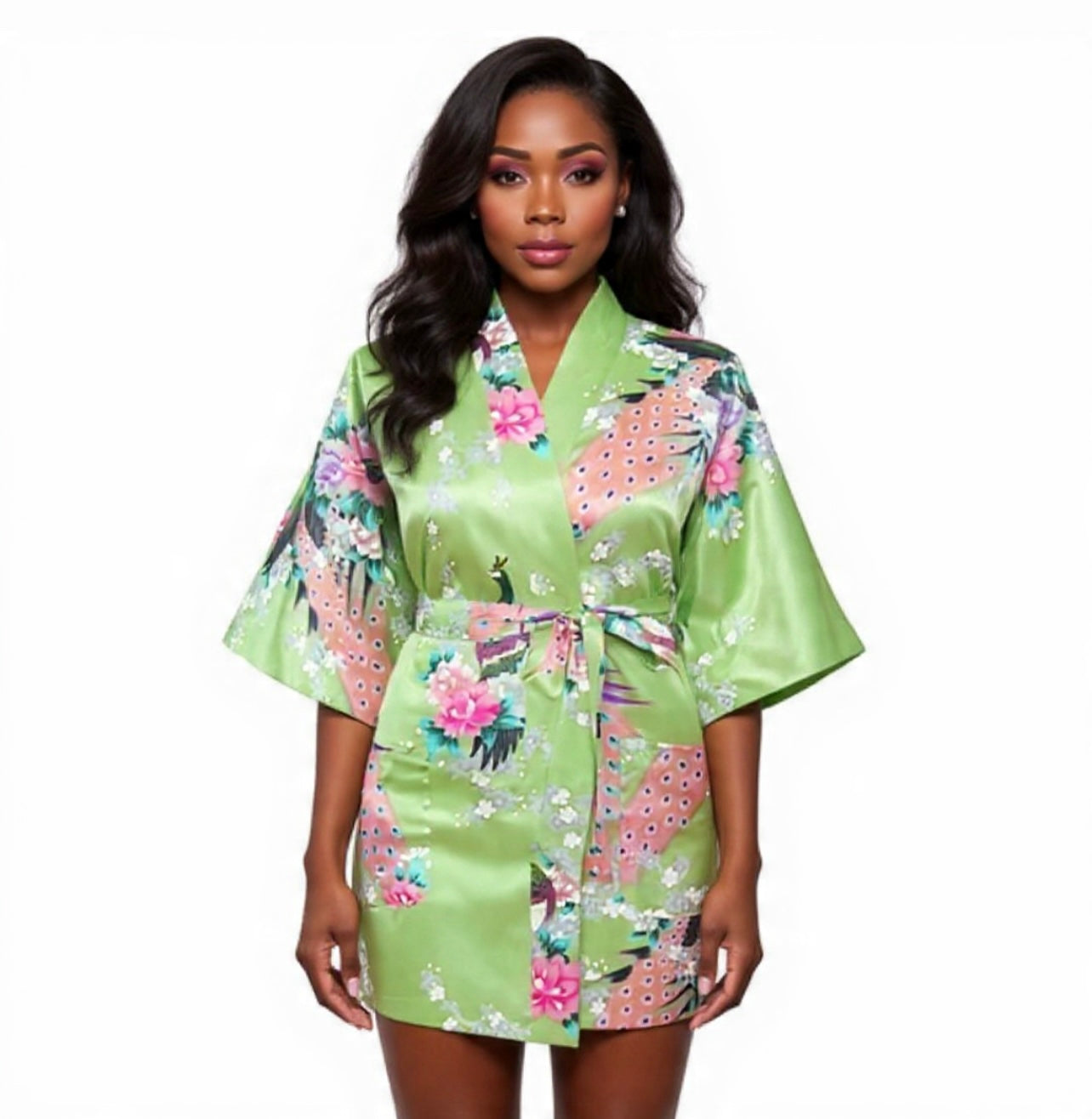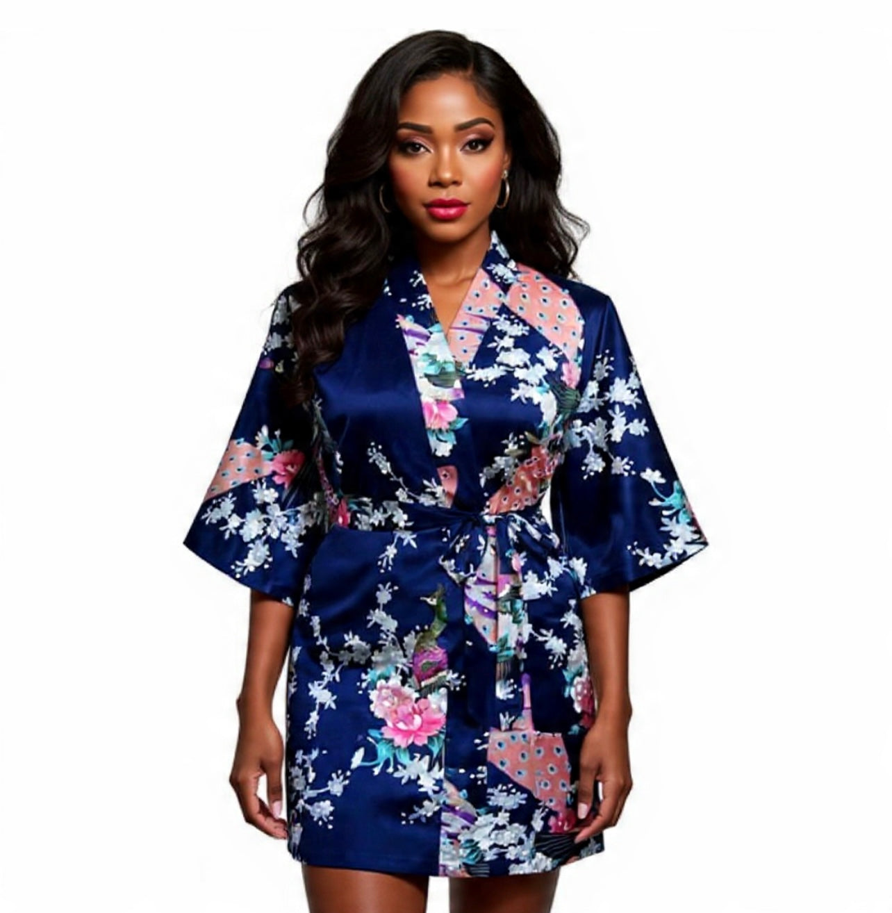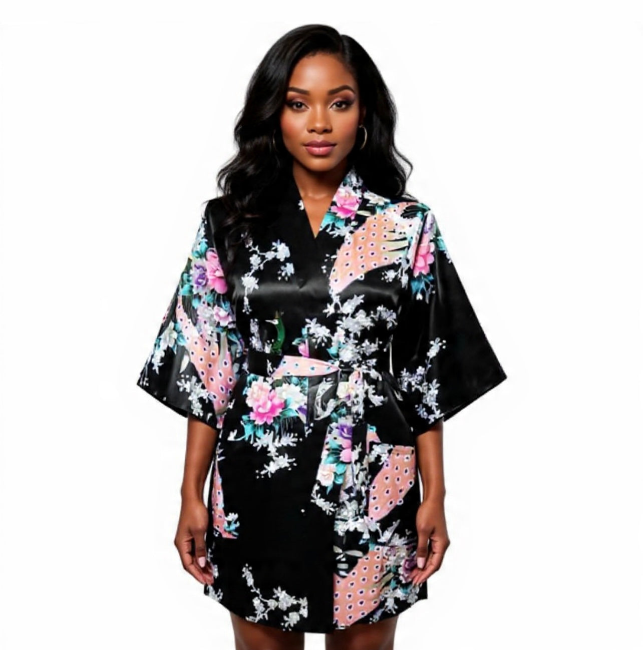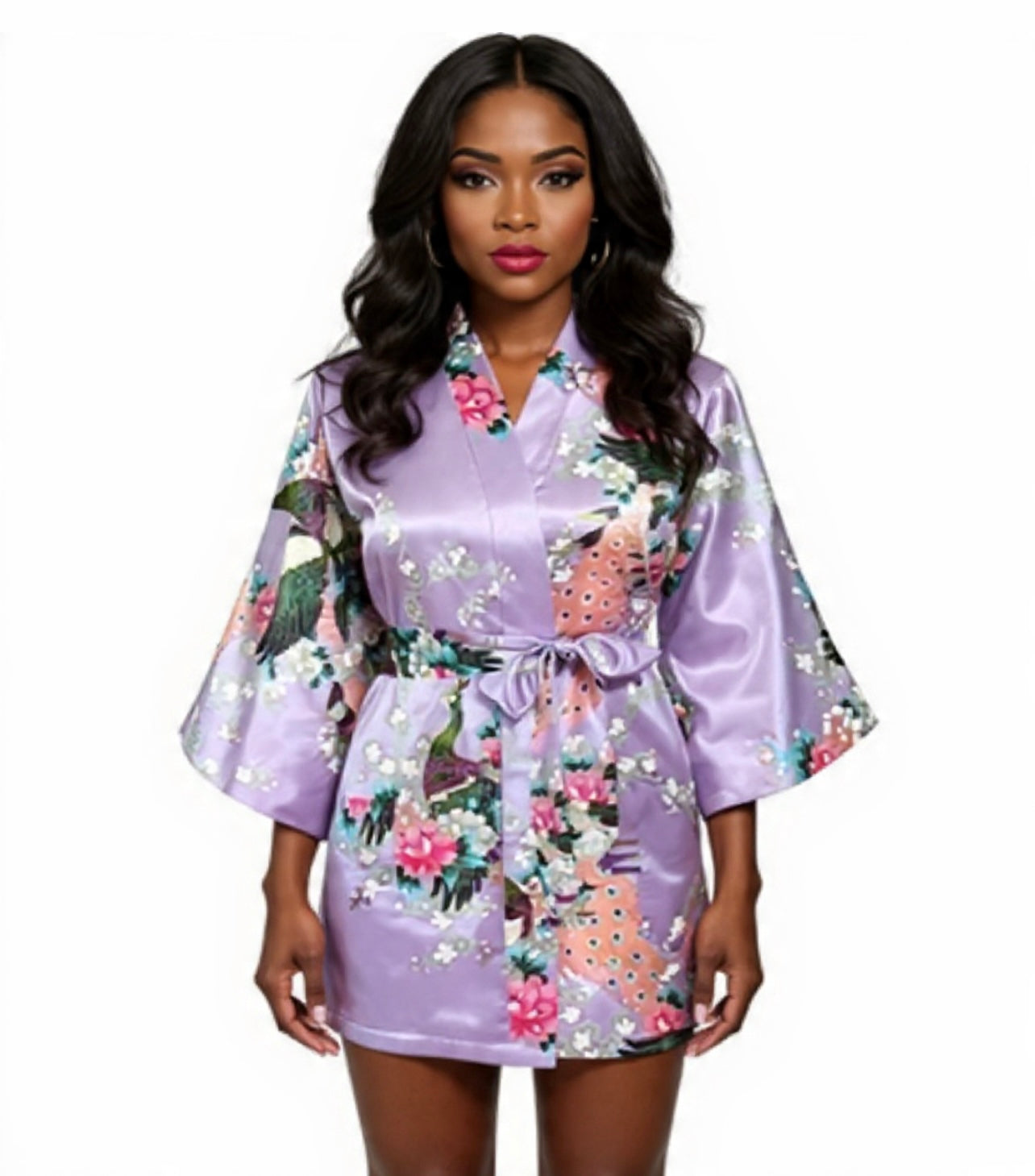 For bedtime, lounging and beyond. In luxe silky material, a kimono style robe with a v-neckline and matching print tie waist.