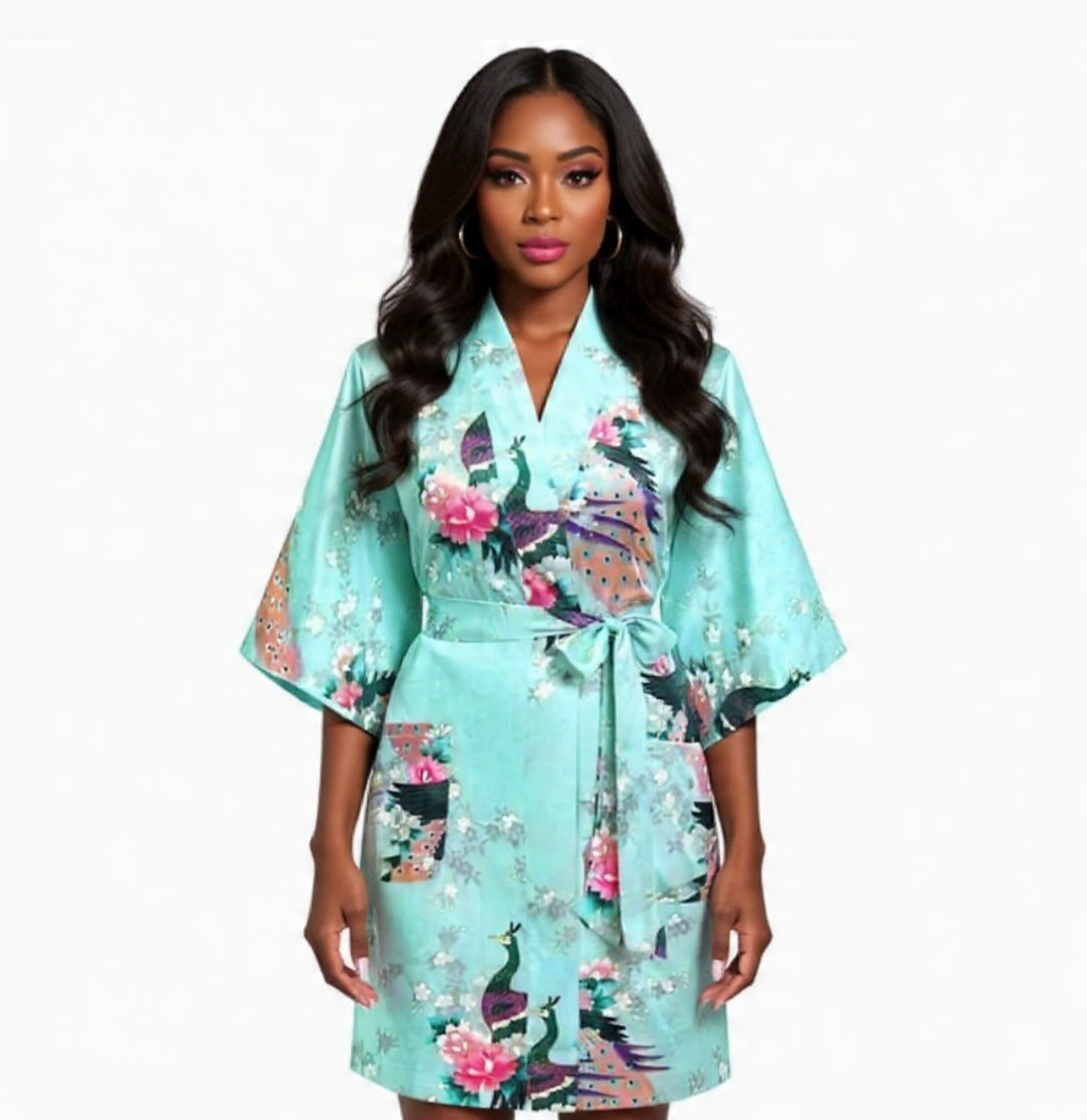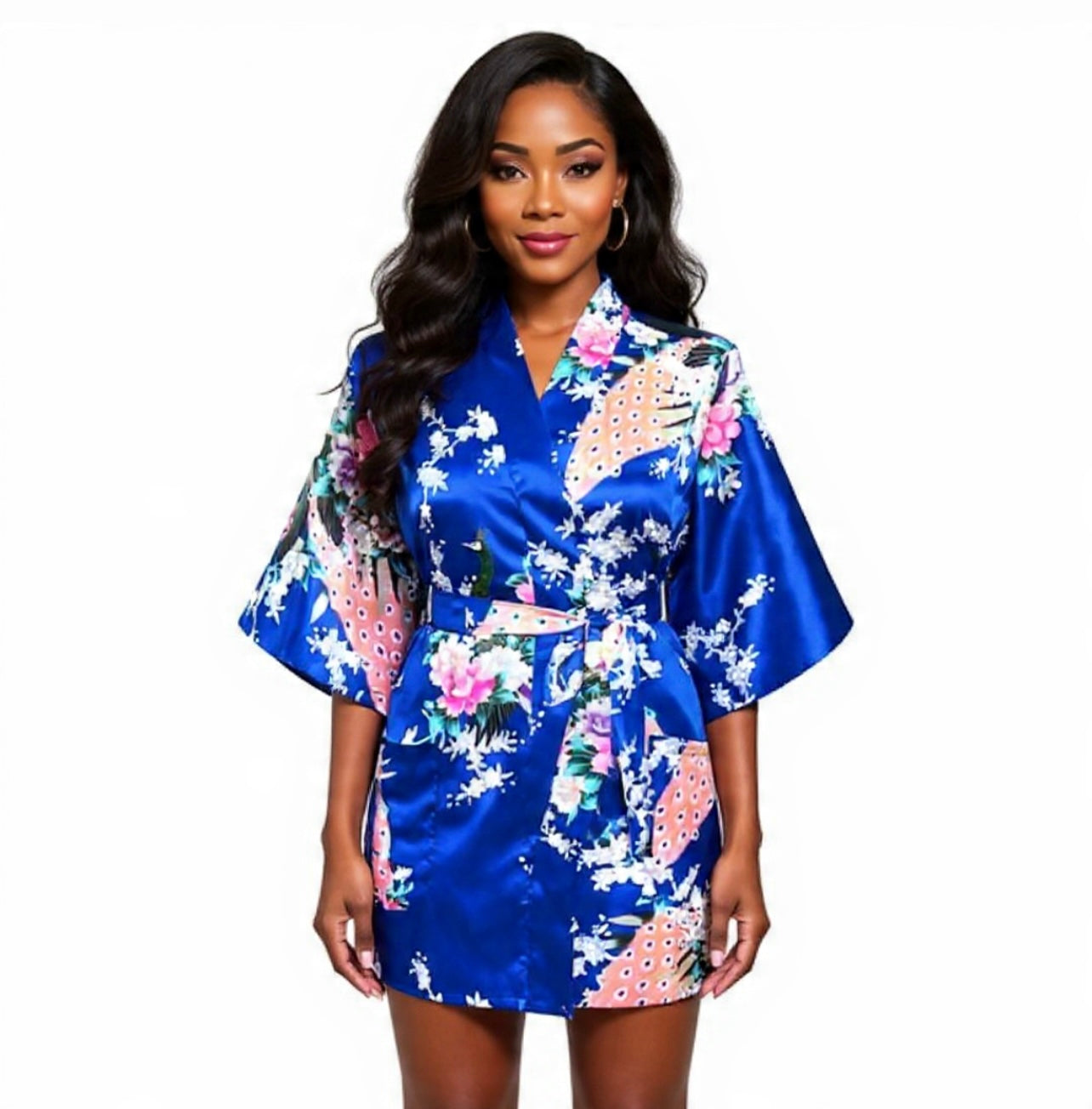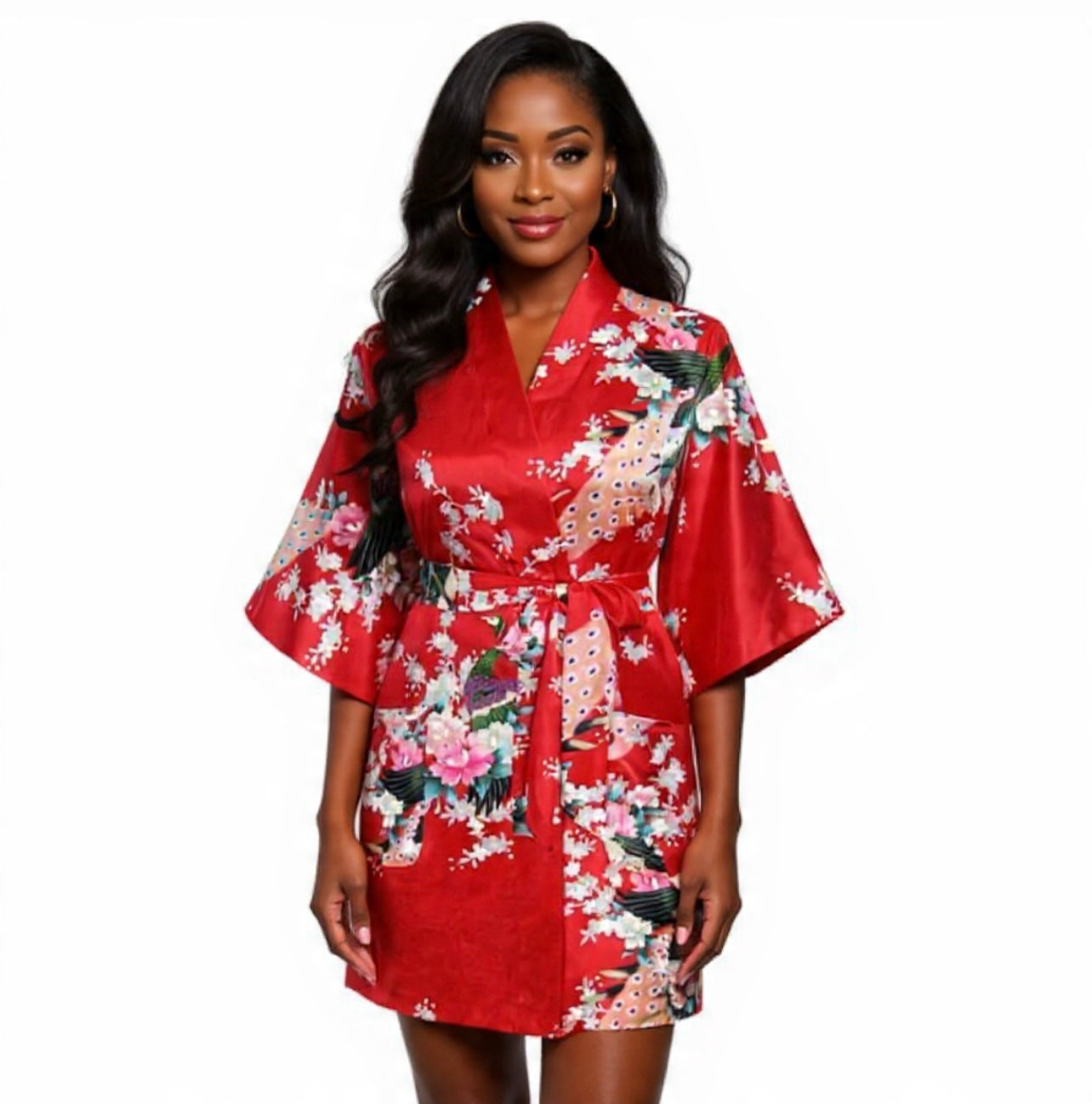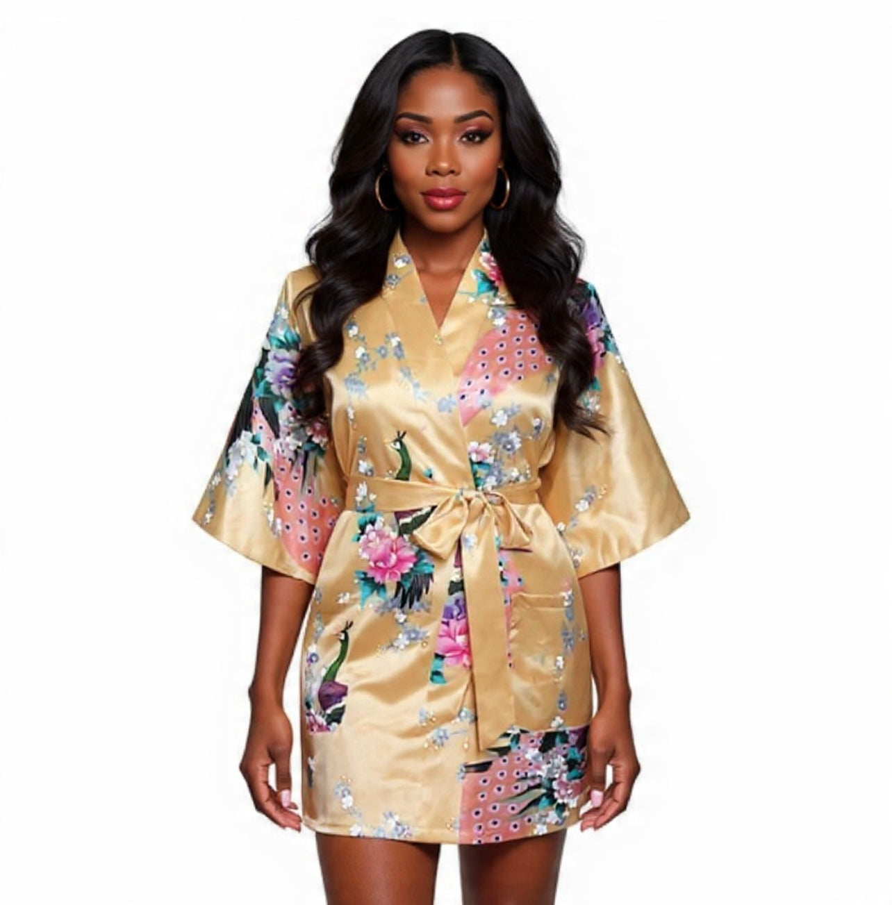 For bedtime, lounging and beyond. In luxe silky material, a kimono style robe with a v-neckline and matching print tie waist.